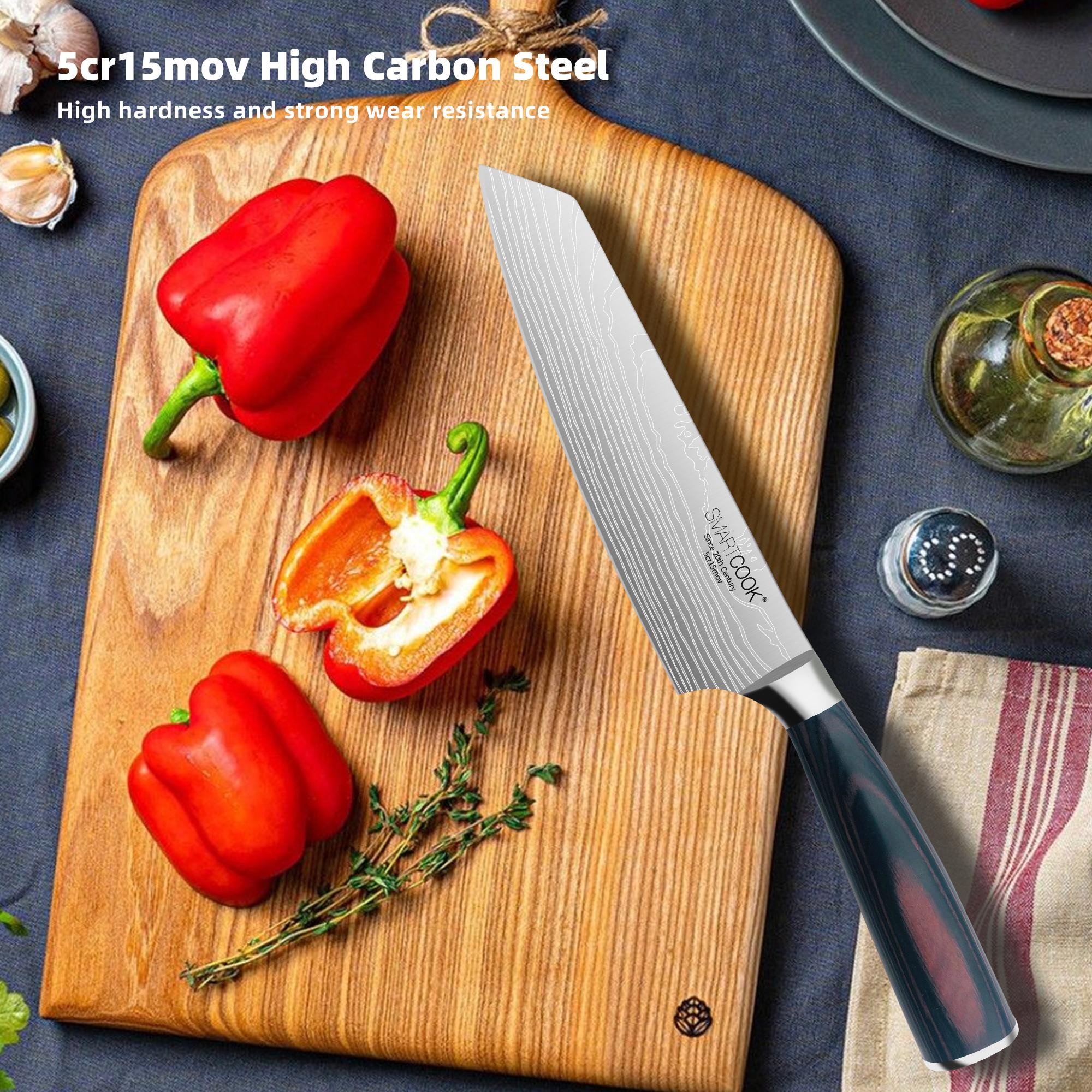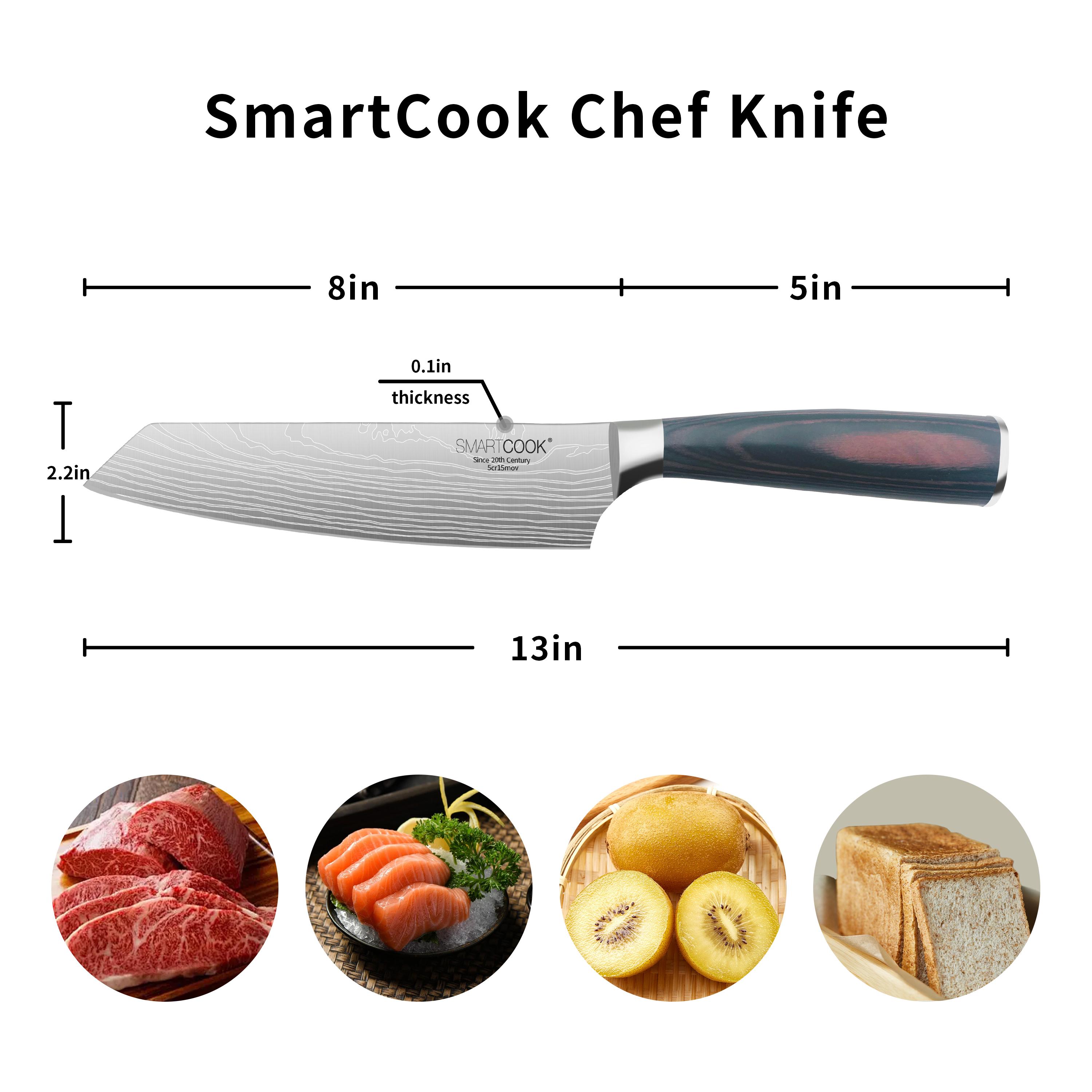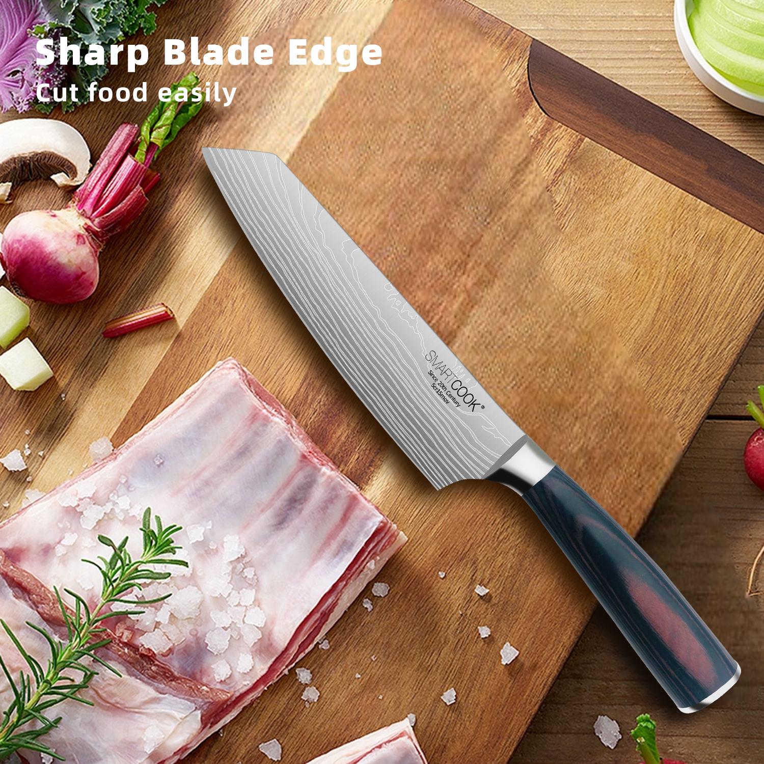 Discover the SmartCook 7-1/2" steak knife with precise serrations, an ergonomic parker wood handle, and forged from Cr13Mo04 premium carbon stainless steel for durability and a never-sharpening edge perfect for steaks.